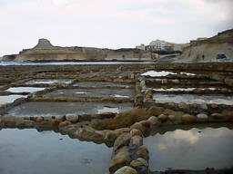 Salzpfannen an der Nordküste und Blick entlang der Westküste von Gozo: